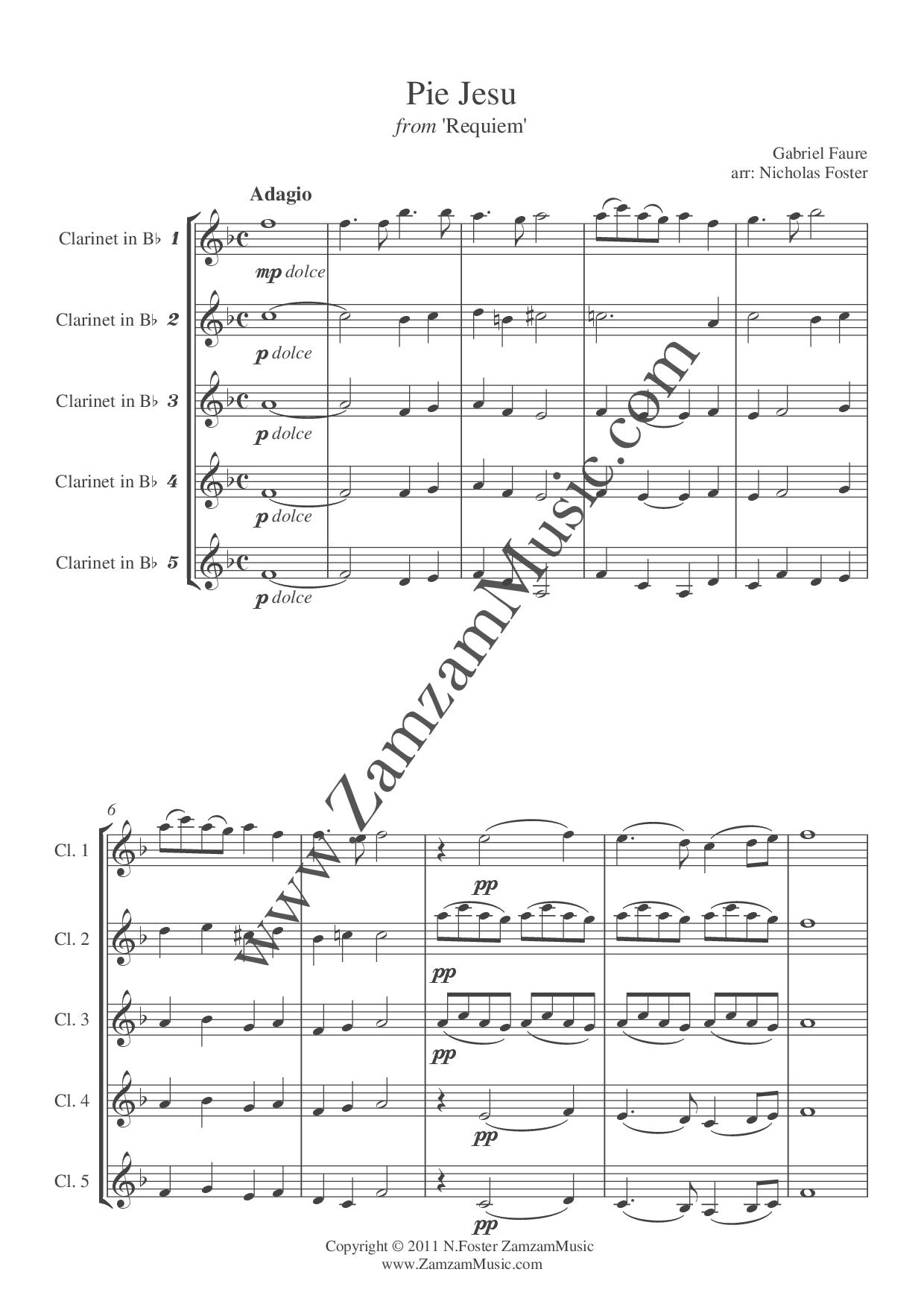 The 4th movement of Faure’s Requiem arranged for 5 clarinets. Intermediate level.