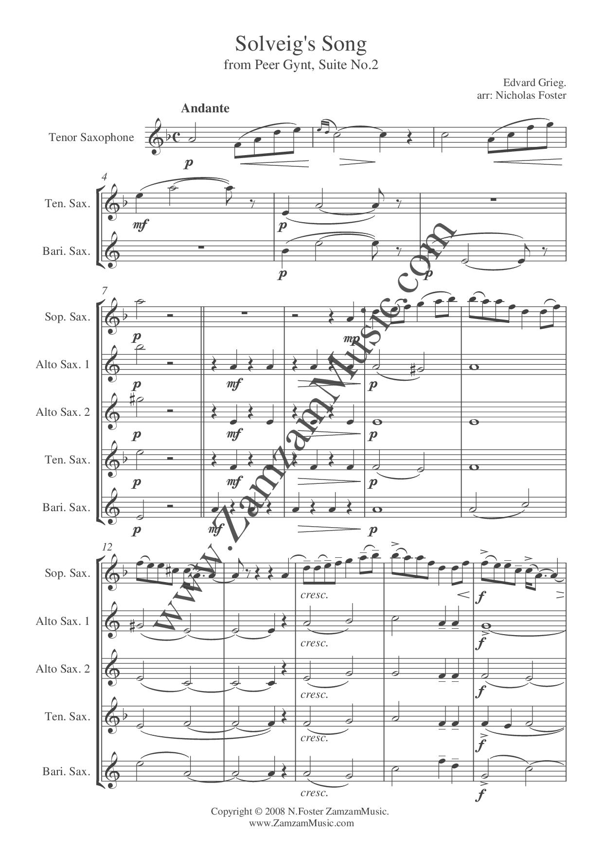 Solveig’s Song from Peer Gynt Suite No.2, Op. 55. Saxophone quintet for SAATB. Advanced.