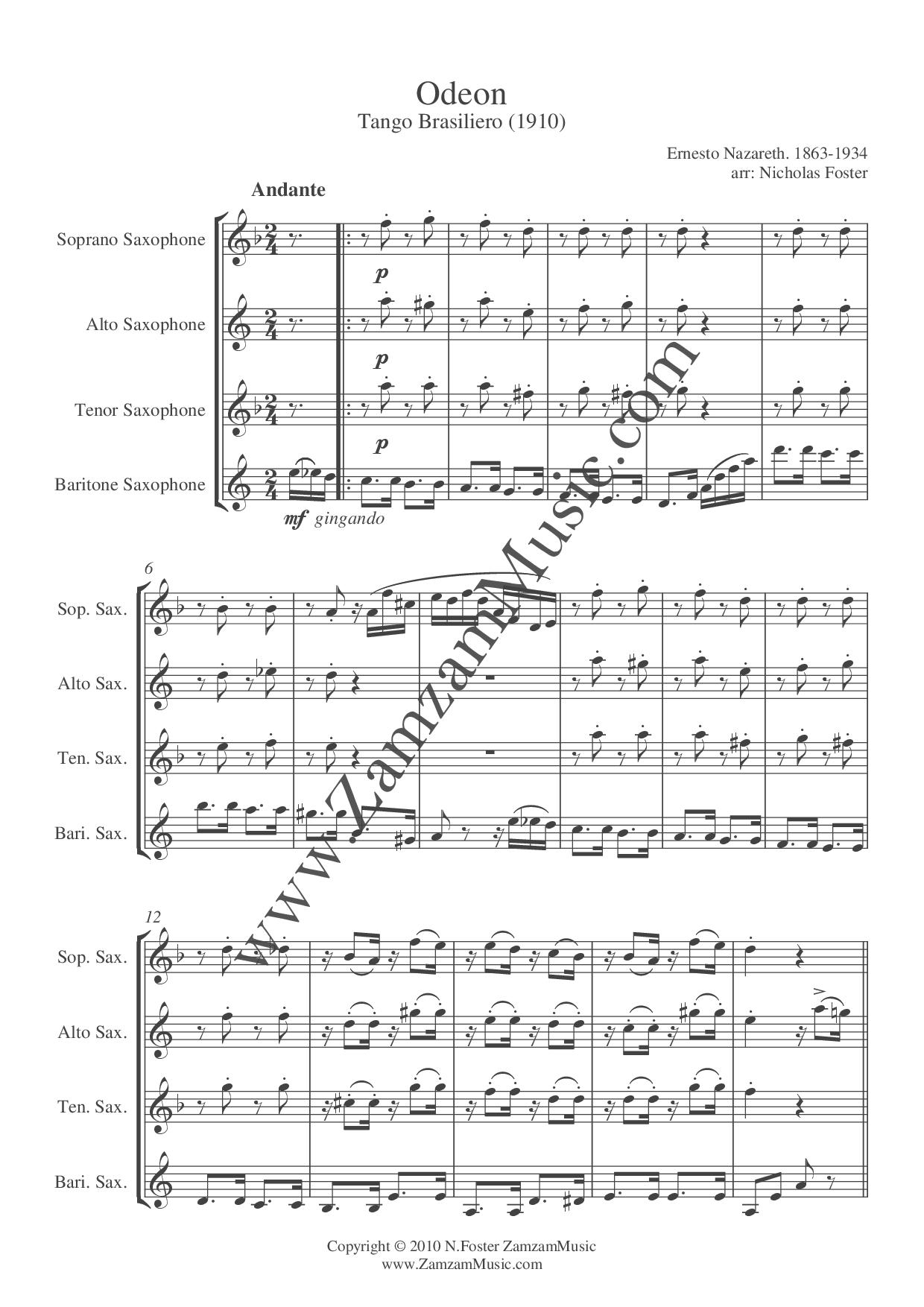 Ernesto Nazareth wrote this Tango Brasiliero to celebrate the opening of the new Odeon cinema in Rio de Janeiro where he was the resident pianist, playing for the silent movies. Arranged for saxophone quartet SATB. Features the baritone sax.
