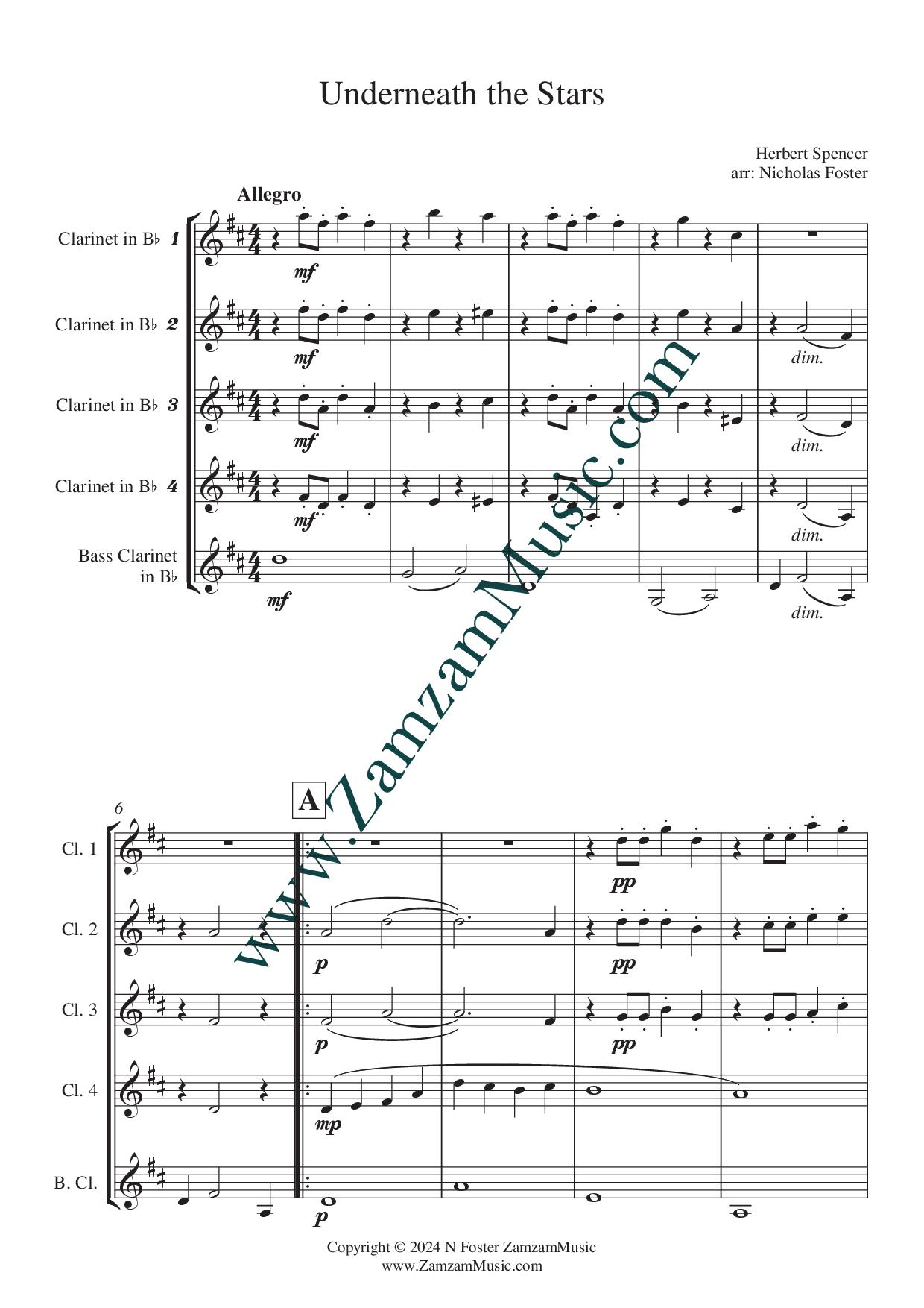 Herbert Spencer’s endearing melody, Underneath the Stars, arranged for 4 clarinets and bass clarinet. This is a perfect ‘palm court’ item. Intermediate level.