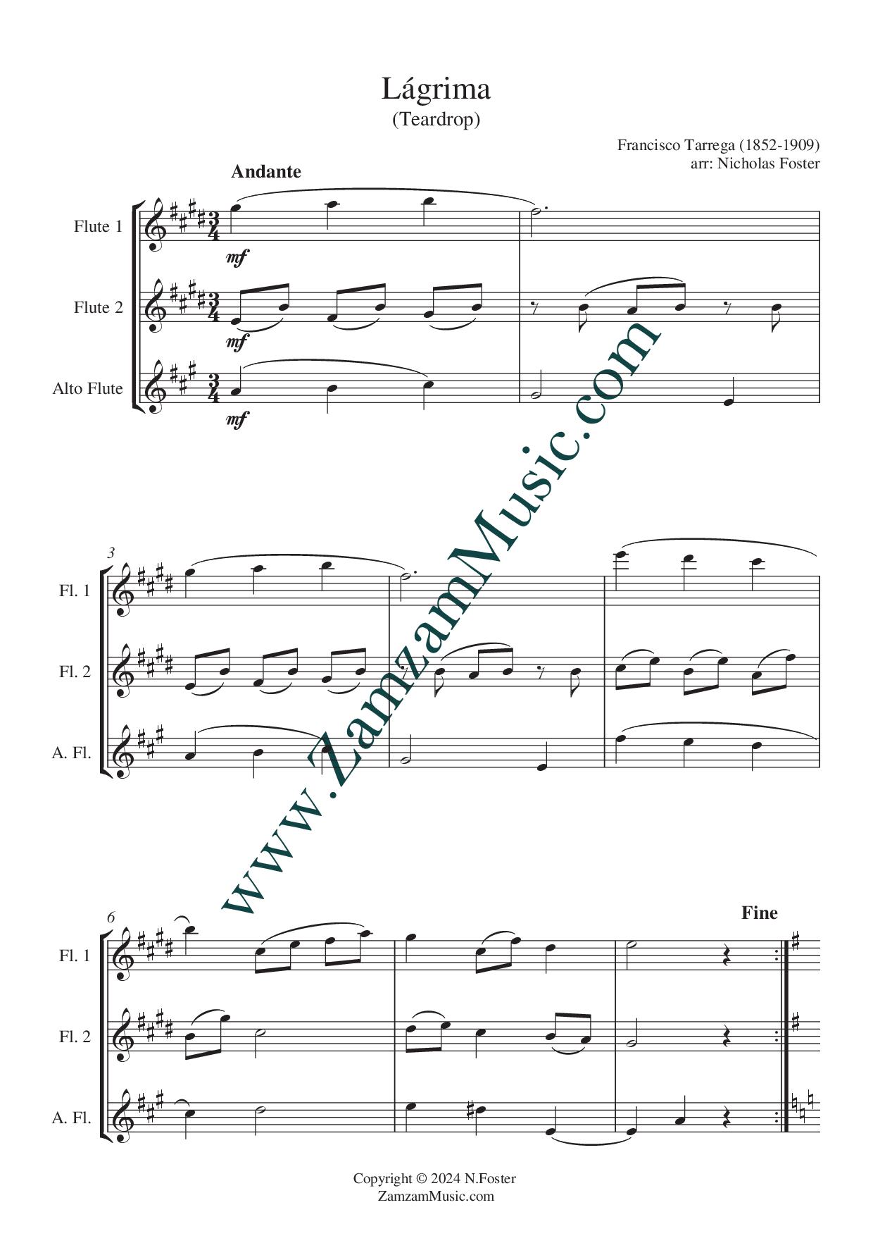 Lágrima (Teardrop) is a romantic prelude for solo guitar by Spanish guitarist Francisco Tárrega. It is one of the best-known original compositions by Tárrega. Arranged for flute trio; intermediate level.