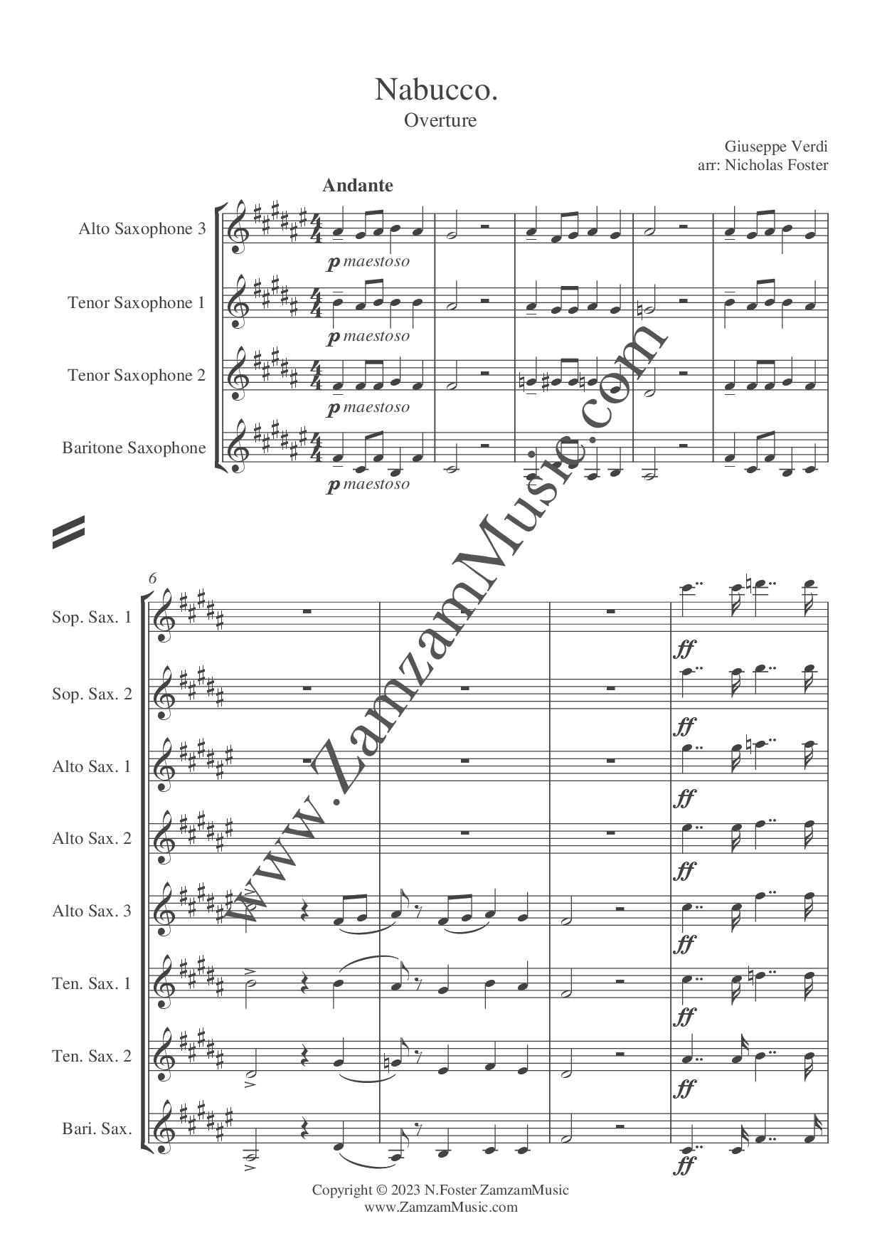 The complete Overture to the opera Nabucco by Giuseppe Verdi, arranged for 8 saxophones. SSAAATTB. Advanced level.